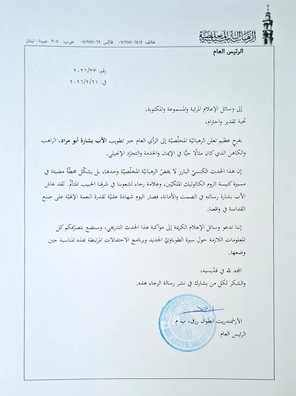 وصدر عن الرئاسة العامة للرهبانية المخلصية بيانٌ موجّه إلى وسائل الإعلام المرئية والمسموعة والمكتوبة، أعلنت فيه، تطويب الأب بشارة أبو مراد، الراهب والكاهن الذي كان مثالًا حيًا في الإيمان والخدمة والنذر الإنجيلي.