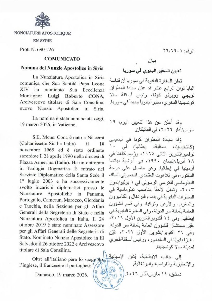 أعلنت السفارة البابوية في سوريا أن قداسة البابا لاوُن الرابع عشر عيّن المونسنيور لويجي روبرتو كونا، رئيس أساقفة سالا كونسيلينا الفخري، سفيراً بابوياً جديداً لدى سوريا.