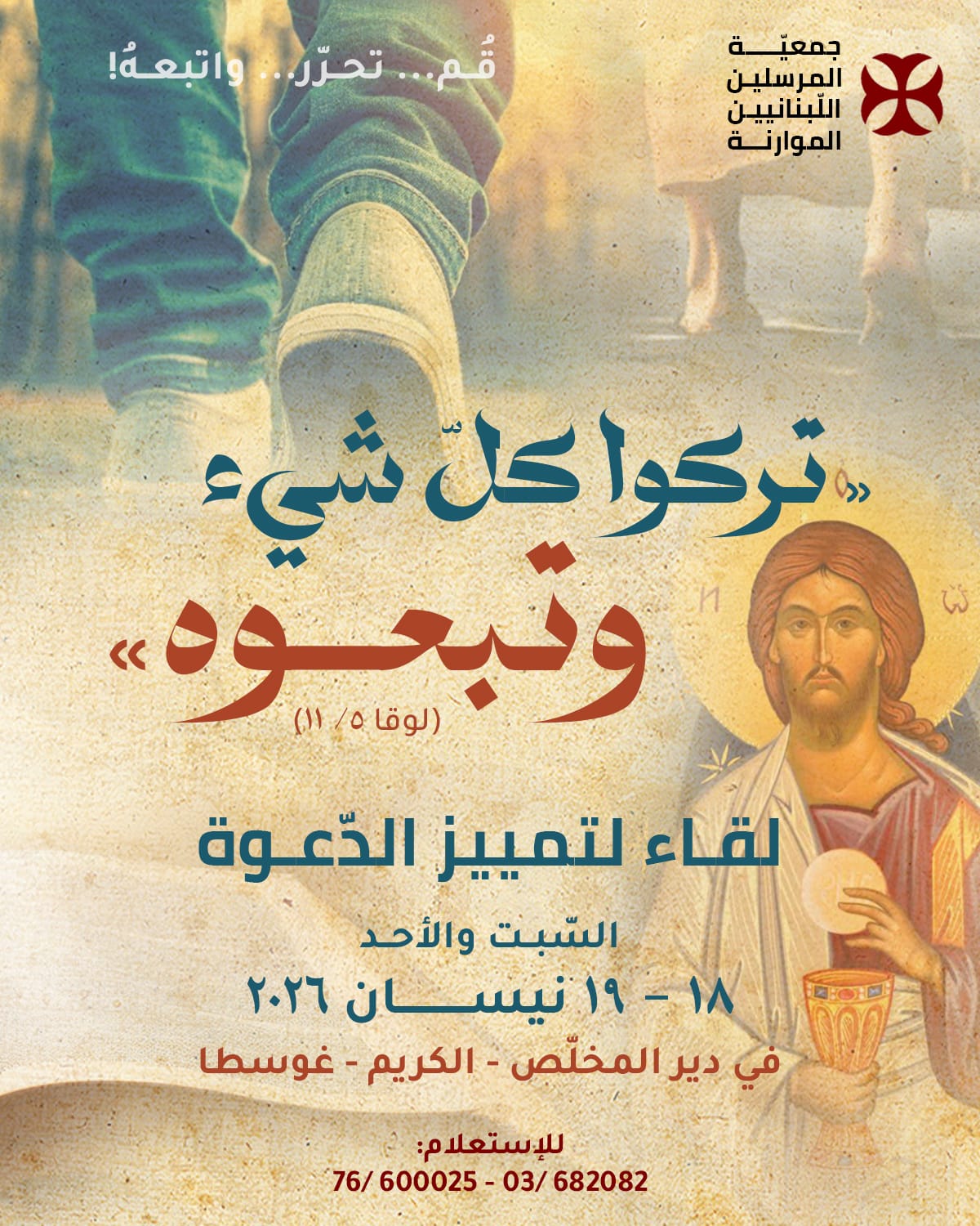 تُنظّم جمعيّة المرسلين اللبنانيين الموارنة لقاءً لتمييز الدعوة بعنوان "تركوا كلّ شيء وتبعوه"، وذلك يومي السبت 18 والأحد 19 نيسان 2026، في دير المخلّص – الكُرَيْم، غوسطا.